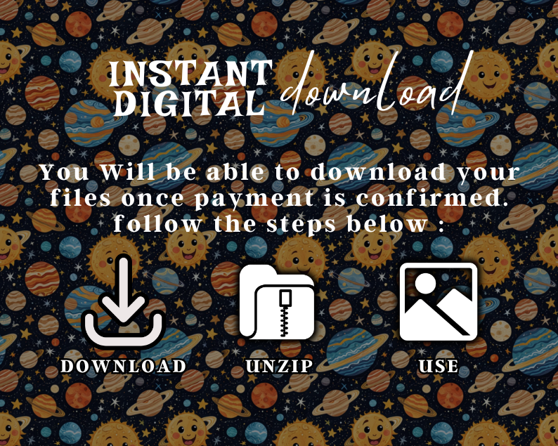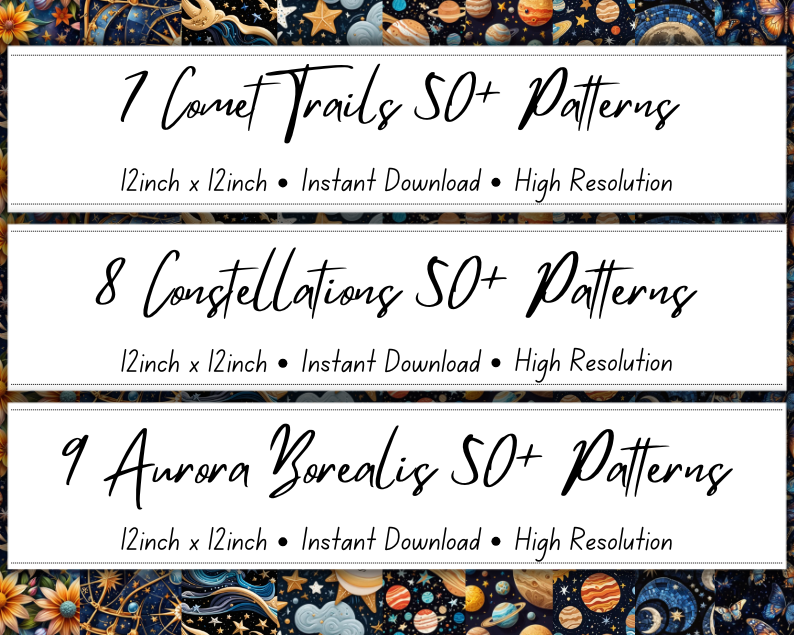 Whether you're crafting, designing, or decorating, this collection offers a universe of possibilities. Each pattern is carefully designed to capture the awe of the cosmos, perfect for digital and printable projects.