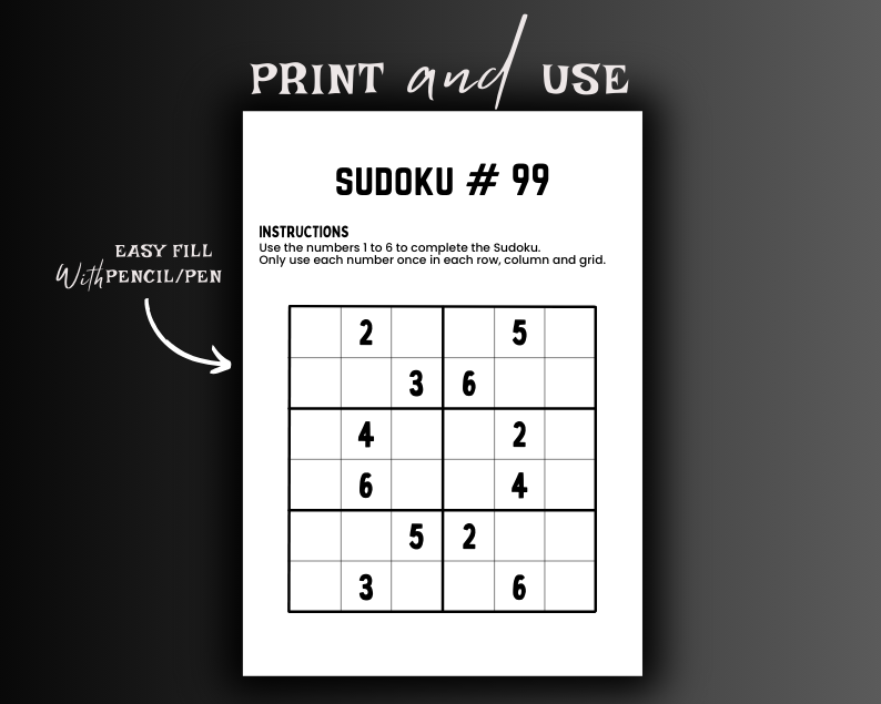 Challenge your brain with the Sudoku Puzzle 6x6 Game! This game is designed for puzzle enthusiasts of all skill levels, offering three levels of difficulty: Easy, Hard, and Expert. Whether you're a beginner looking for a gentle challenge or an experienced solver seeking a test of your skills, this game has something for everyone. The puzzles come with solutions for each level, allowing you to check your progress and improve your puzzle-solving abilities. This printable Sudoku game is available as an instant download in PDF format, making it easy to print and enjoy anytime, anywhere.