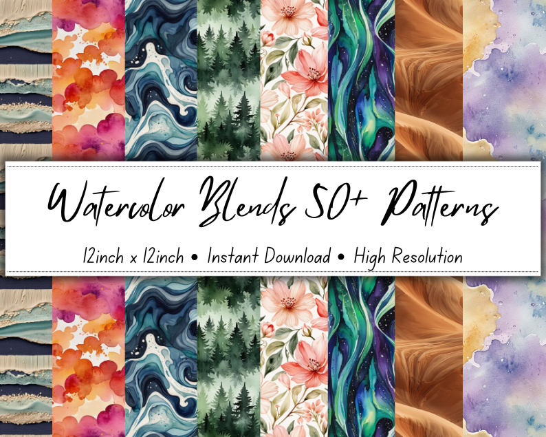 Elevate your creative projects with our Watercolor Blends 50+ Patterns Collection — Whether you're designing invitations, scrapbooking, branding materials, packaging, or digital backdrops, these high-resolution 12x12 inch patterns will add a serene and artistic touch to your work.